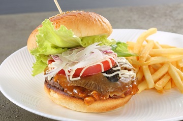 「ビーフバーガー」は、成田市特産の歯ごたえ豊かな「鉄砲漬け」を食感のアクセントに、千葉県産ピーナッツを使用した特製ピリ辛味噌ソースが絶妙に絡み合う、風味豊かな一品。