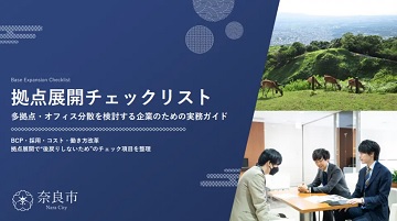 市域の一部が関西文化学術研究都市(けいはんな学研都市)となっている奈良市(仲川元庸市長)はこのほど、多拠点化やオフィス分散を検討する企業向けに、実務的な検討ポイントを体系化した「拠点展開チェックリスト」を公開した。